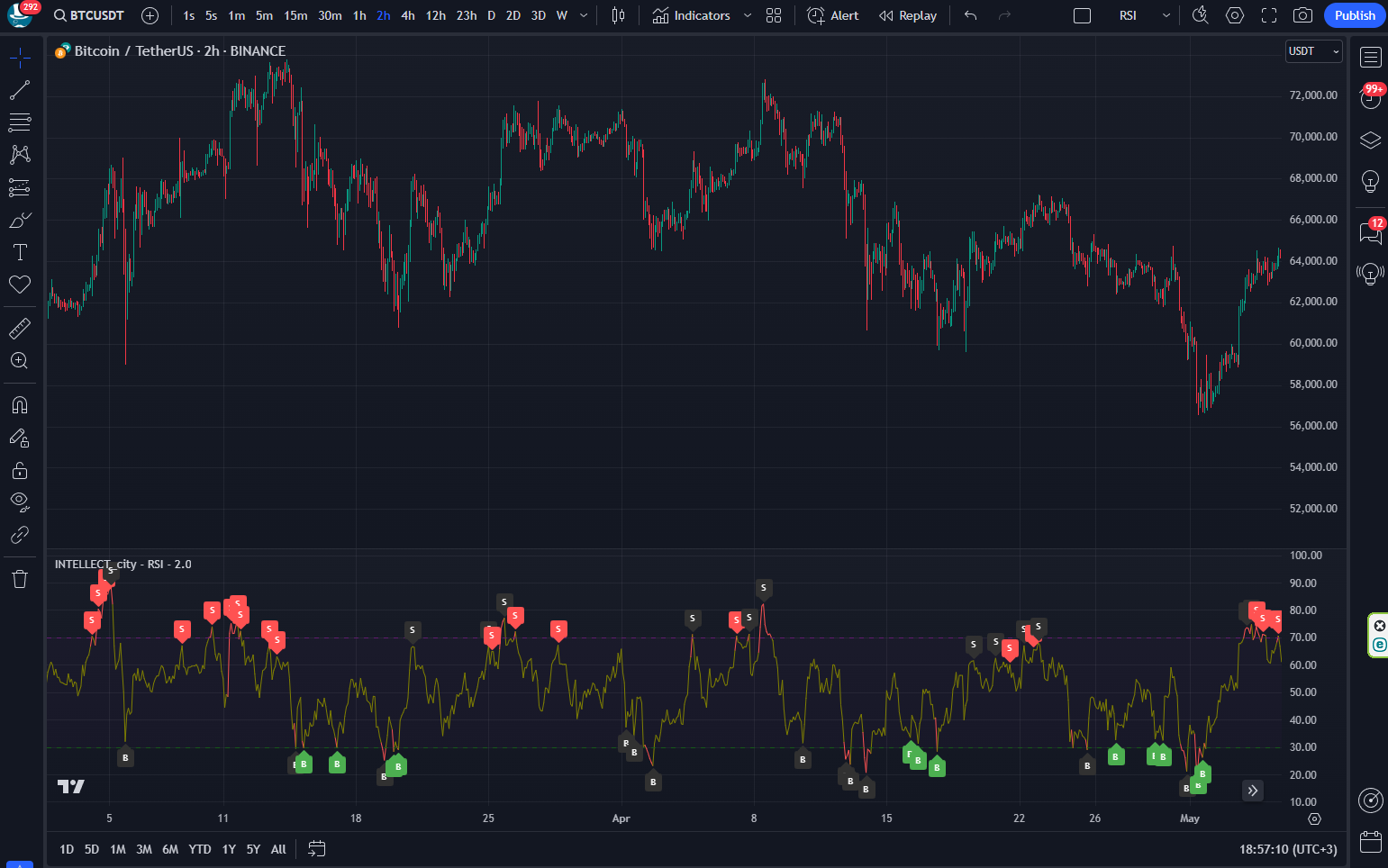 How it happens: When the algorithm (indicator) breaks the line upper (at values 70) or lower (at values 30), and are in their range (upper or lower), an excellent position for ENTRY is obtained, if at the top it means (S) SELL (red), if at the bottom (B) BUY (green). The main thing is that it is located, or touches the upper or lower border (after when they say signals B (BUY) or S (SELL) this is already basically a confirmation)